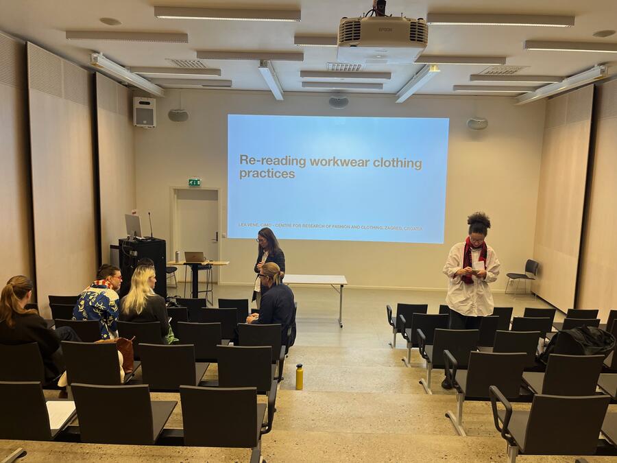 As part of the Erasmus exchange between CIMO and KHIO (Oslo), Lea Vene was a guest lecturer at the undergraduate and graduate study of fashion design in November 2023. The visit was organized in collaboration with Ida Falck Øien and Johanna Zanon. Lea held two lectures and a workshop for students and presented current research at CIMO with a focus on the topic of workwear and the concept of soft arts.