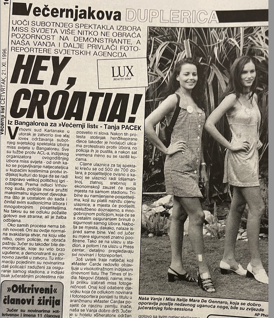 Iscrpno novinarsko i sponzorsko praćenje izbora ljepote s naglaskom na sve krugove izbora za Miss Hrvatske, praćenje privatnog života modela te također medijsko izvještavanje o aferama koje su pratile izbore (Primjeri naslova: Hrvatske ruže u Umagu, Festival mode i ljepote na Forumu, Biramo najljepše od najljepših, Osamnaest snova za jednu krunu, Tresao se Poljud, a i cili Split, Miss Hrvatske i najljepša Europljanka u subotu se više nego uspješno otisnula u svijet - Branka osvaja Italiju, Sretno za zelenookog anđela iz Umaga, Vanja Rupena - došlo mi je da plačem pa da vrištim od sreće, Urnebesan doček novoj Miss Hrvatske Vanji Rupeni u Umagu - Vanja, to je naša Vanja!, Vanja Rupena je zakinuta za krunu Miss Hrvatske, U nedjelju se bira ljepotica Hrvatske 1996. - finalistice su u Splitu, Najljepše želje novoj hrvatskoj Miss, Miss Hrvatske Vanja Rupena ekskluzivno za čitatelje Večernjeg lista iz Bangalorea - Ni ptica nam ne može prići, Hoće li Martina otvoriti modi show,. i sl.)